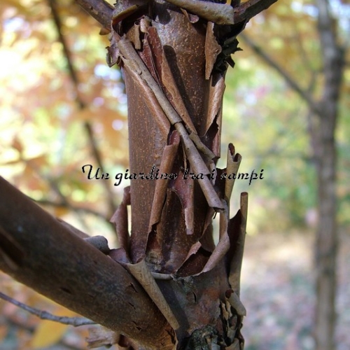 Acero dalla corteccia sfogliante molto bella. Fogliame trilobato dal colore autunnale rosso vivo.